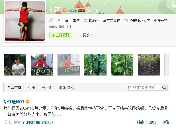 刘翔微博宣布离婚 曝葛天借假怀孕骗婚