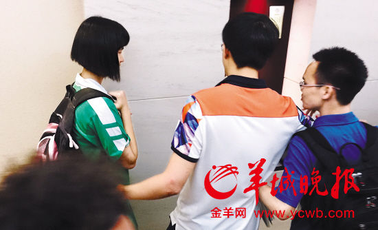 羊城晚报讯:25日,广东高考成绩放榜,全省文理科前十的考生备受关注。在广州执信中学,为“争抢”该校全省高考理科前十的高三14班学生叶彤,北京大学的两名招生老师与清华大学的招生老师(穿蓝衣者)理论起来。
