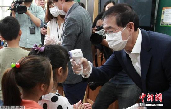 当地时间2015年6月17日,韩国首尔,韩国首尔市长朴元淳为小学生量体温,预防MERS疫情。
