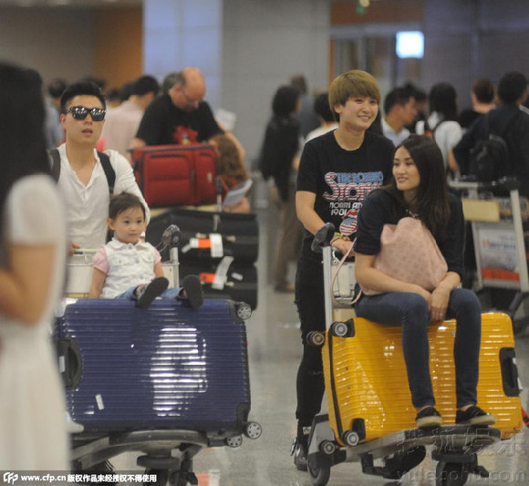 当天李小鹏和老婆各自推着行李车走出机场,萌娃奥莉坐在爸爸的行李车上见到接机人员笑容不断。