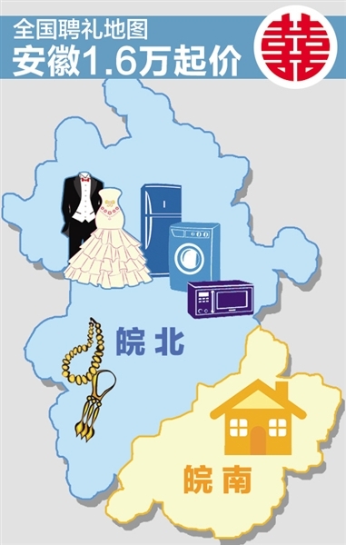 “一般来说,需要6万元礼金、三个金首饰、四件家电和衣服,加起来差不多10万元。”张春雷说,有的家庭要价高些,就需要20万左右,低的至少也得5、6万元。采访中,记者了解到,皖北地区平均聘礼大概在5万元起价,让人惊讶的是,越是贫困的地方,聘礼的开价越高,比如蒙城县一个乡镇,10万元起价,20万、30万元的也比比皆是。