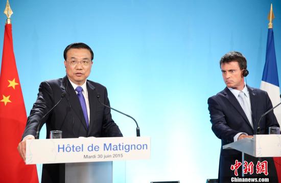当地时间6月30日下午,中国国务院总理李克强在同法国总理瓦尔斯会谈后共同会见记者。中新社记者 刘震 摄