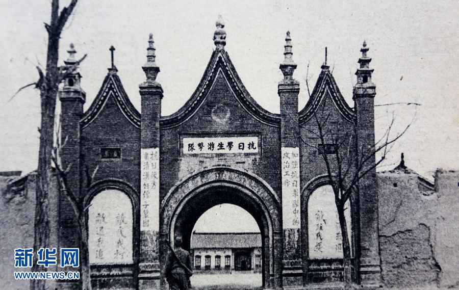 这是侵华日军1938年拍摄的位于临汾的抗日学生游击队学校,照片中一名日军正在观看学校大门上的宣传文字(上联:加强抗日军队中的政治工作;下联:肃清汉奸份子巩固抗日后方。右:敌进我退,敌驻我扰;左:敌疲我打,敌退我追)。 6月30日,重庆市北碚区档案局(馆)公布一批民间征集抗战档案的最新研究成果,其中侵华日军随军记者和行军档案留下的多份档案真实再现了中国共产党领导的敌后抗战细节。这些日本档案中细致地描述了中国共产党领导的八路军、新四军,在危急形势下挺进华北、华中的敌后,广泛发动群众,开展游击战争,狠狠打击日寇,开辟广阔敌后战场等情况。新华社记者 刘潺 摄影报道