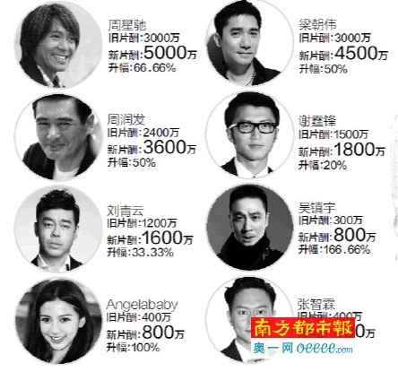 女演员方面,Angelababy与黄晓明结婚后,在内地的人气越来越旺,华谊兄弟几个月前再将其片酬翻一番,由去年的400万升至800万。至于已经不做演员改做导演的周星驰,身价由去年的3000万(导演连编剧和监制)升至5000万,还要另加演出费。