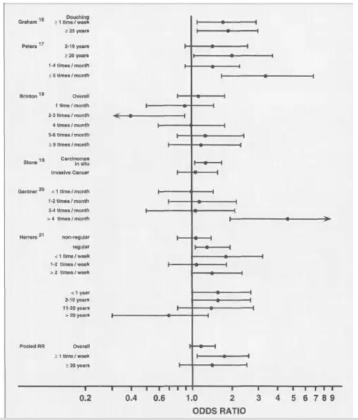 图2大概可以看出阴道冲洗是增加了宫外孕的发生几率?;阕艿氖萏崾荆醯莱逑吹幕颊叻⑸庠械幕崾遣蛔龀逑椿颊叩?.8倍(RR值1.76,CI 1.10-2.82)。研究同时也发现用商业的洗剂较清水更加有风险。另外的一项研究发现阴道冲洗的女性比不冲洗的女性减少30%的怀孕几率,这一差别在年轻女性中尤为明显。其中,18-24岁女性怀孕几率下降50%,25-29的女性怀孕几率下降 29%,30-39的女性怀孕几率下降6%。