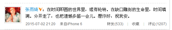 7月2日晚,张雨绮微博发文疑似宣布与王全安离婚。张雨绮写道:“在时间即圆的世界里,缘有轮转。在缺口雕刻的生命里,时间填满。分开走了,也把遗憾多留一会儿。愿你好,祝我安。”