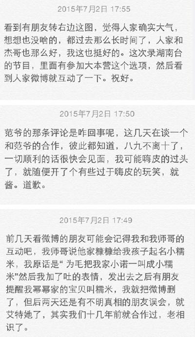 回应范爷:“范爷的那条评论是咋回事呢,这几天在谈一个和范爷的合作,彼此都知道,八九不离十了,一切顺利的话很快会见面,我可能嗨皮的过头了,就随便开了个有些过于嗨皮的玩笑,就酱。道歉。”