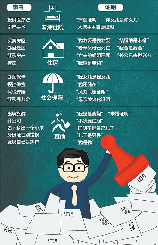 从目前被曝光的“奇葩证明”来看,要求证明亲属关系的占近一半,其中包括证明夫妻、父子、兄弟、爷孙等各种关系。此外,还有大量涉及个人状态的证明,包括证明死亡、健在、未婚、无犯罪记录等个人信息。
