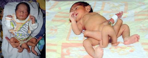 2012年4月,巴基斯坦卡拉奇市有一名男婴出生便有6只腿,医生称该婴儿患有罕见的遗传疾病。其父亲是一名X光放射线技师。巴基斯坦国家儿童健康研究所主任贾马尔·拉扎告诉记者,其实降生的并不是一个婴儿,而是两个,但其中一个是还未成熟的早产儿。