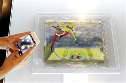 现场展出的《大闹天宫》赛璐璐片人景合成电影画面手稿,吸引动画爱好者拍照留念。 本报记者 叶辰亮摄