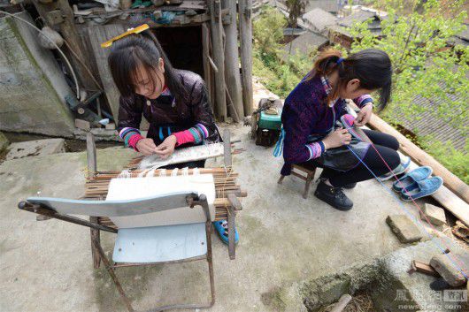 占里村的侗族妇女在纺纱。
