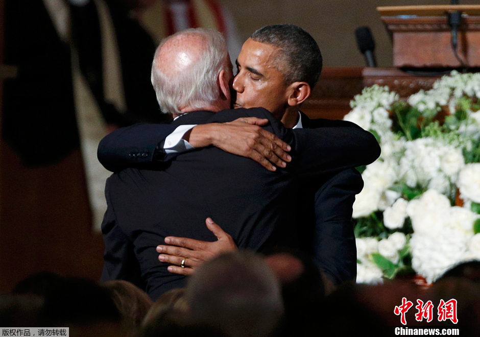 当地时间2015年6月26日,美国查尔斯顿教堂枪击案遇害者、伊曼纽尔非裔卫理圣公会教堂牧师、前南卡罗来纳州参议员Clementa Pinckney悼念仪式及葬礼举行。美国总统奥巴马及一众政要出席悼念仪式。图为奥巴马拥吻拜登。