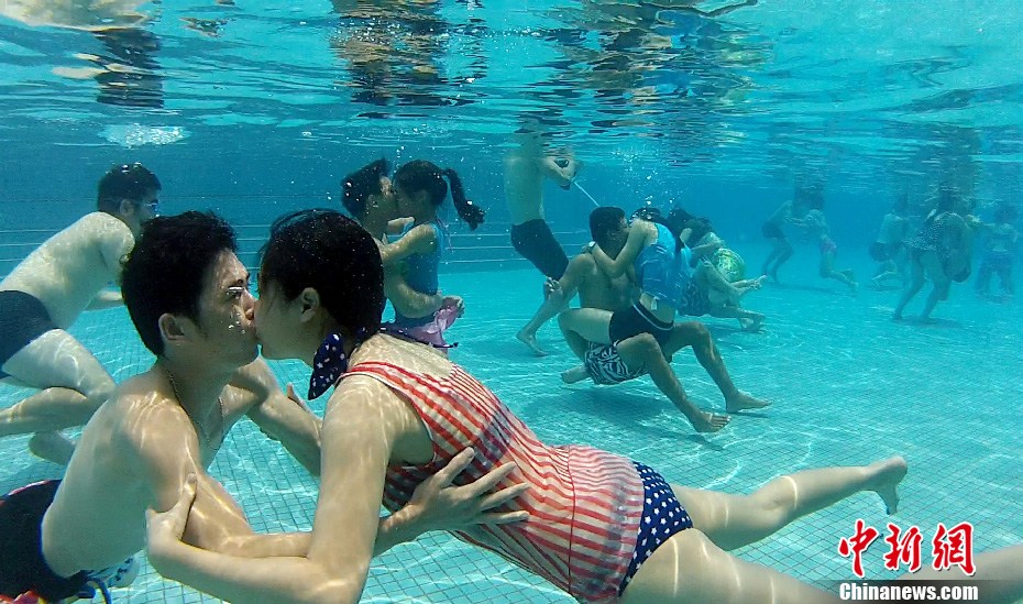 2013年7月6日是国际接吻日,广州长隆水上乐园举办了一场别出心裁的有趣而浪漫的水下接吻比赛,吸引了10对情侣参加角逐。一对“80后”情侣张先生和林小姐以水下连续接吻57秒的优异成绩,成为当日活动的冠军。中新社发 刘卫勇 摄