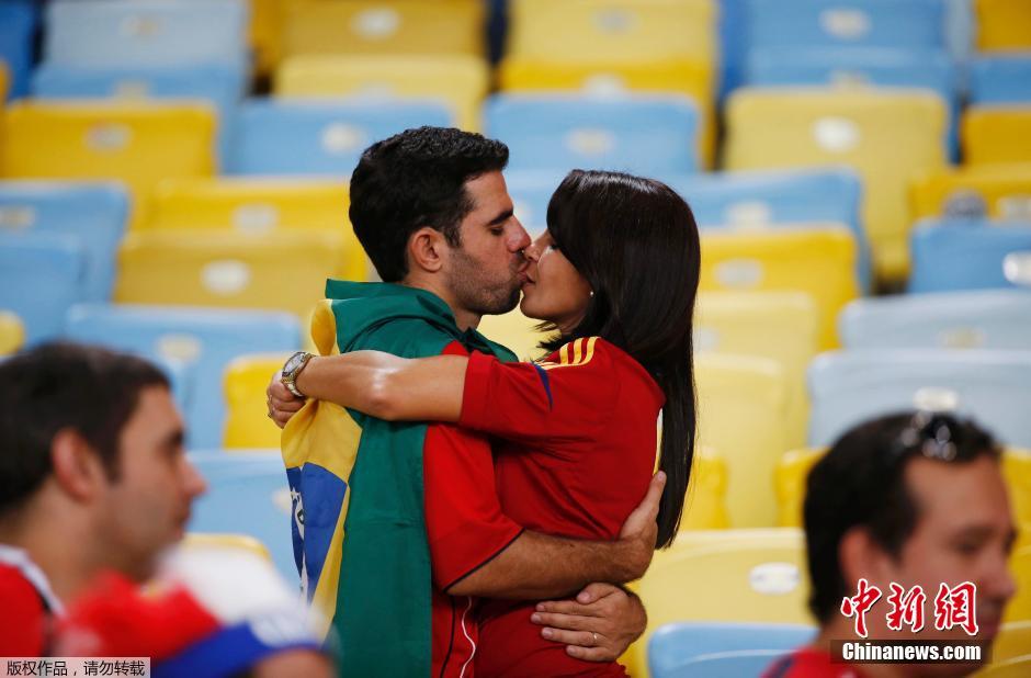 北京时间6月19日凌晨3点(巴西当地时间18日下午16点),2014年世界杯B组一场焦点战在马拉卡纳球场展开争夺,卫冕冠军西班牙0-2智利。图为看台上拥吻的球迷。