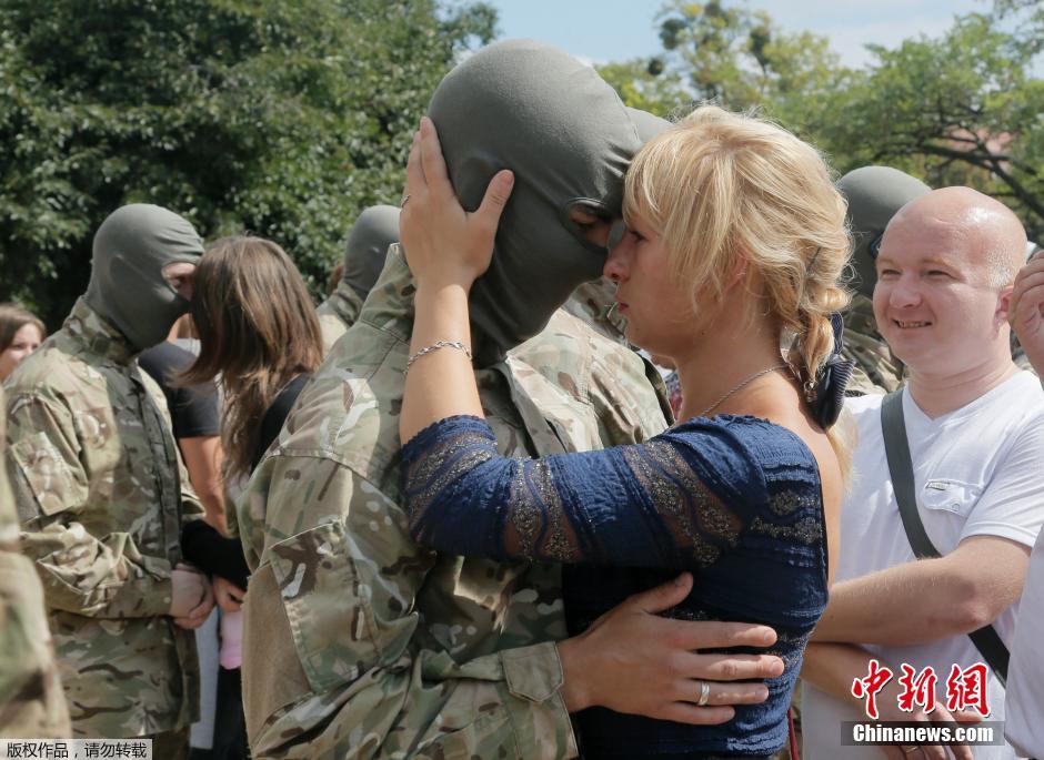 当地时间2014年8月17日,乌克兰基辅,志愿者将启程前往东部加入“亚述”特战营,与亲俄武装交战。图为志愿者们与爱人吻别。