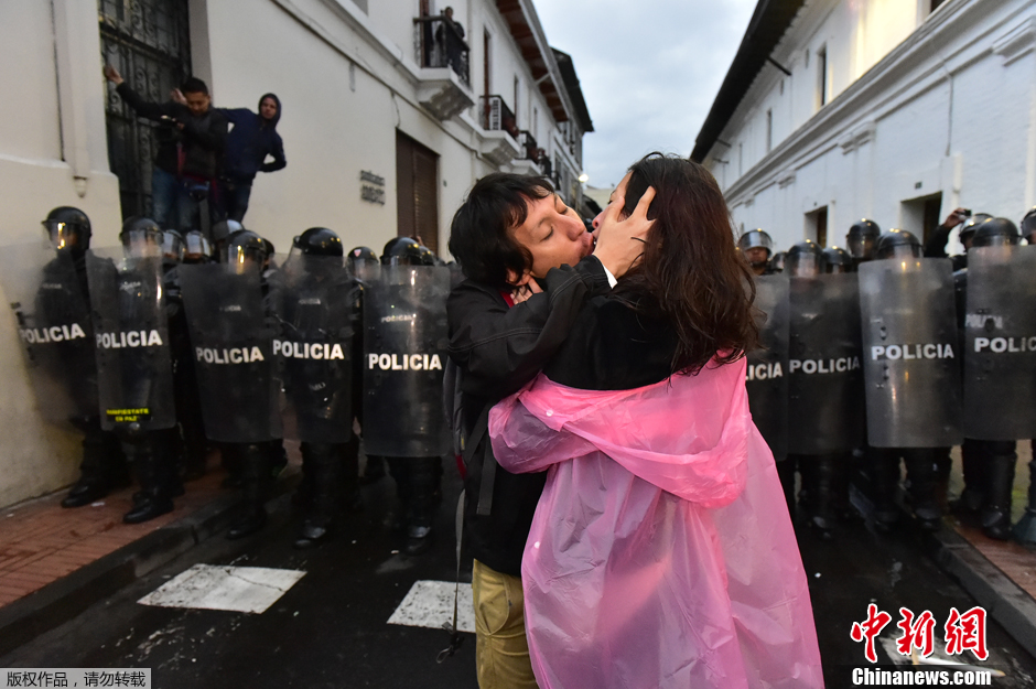 当地时间2015年3月19日,厄瓜多尔基多,民众举行反政府示威,图为一对情侣在示威中接吻。