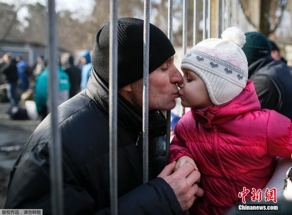 当地时间2015年1月29日,乌克兰基辅,乌克兰军队新兵入伍仪式举行。一位即将随队出发的父亲隔着围栏亲吻自己的孩子。