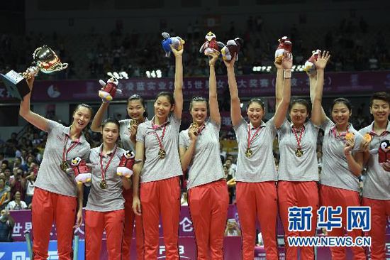 7月5日,中国队队员在领奖台上。当日,2015世界女排大奖赛北仑站比赛落下帷幕,中国队以3比1战胜俄罗斯队,以三战全胜的成绩夺得2015世界女排大奖赛北仑站冠军。新华社记者鞠焕宗摄