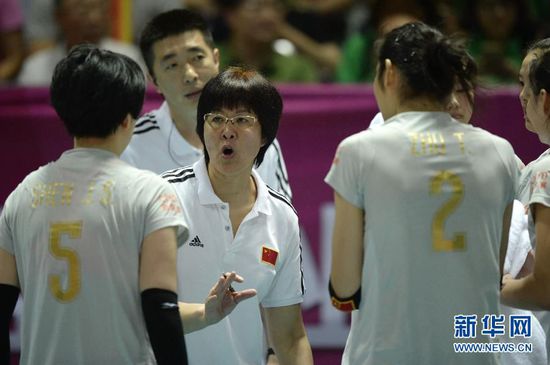 7月5日,中国队主教练郎平(左二)在比赛中指导队员。