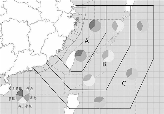 根据台风与浙江的距离,将周边海域划分为3个区域,分别是紧急警报区(A区)、警报区(B区),消息区(C区)。