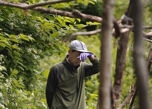 菜园所在的地属于耶鲁大学所有,曾经长满杂草。耶鲁校方也支持这些中国家长们在那种菜,并为他们提供化肥。图为老人在菜园里拭去脸上的汗水。