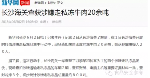 6月2日,新华网(长沙)以“长沙海关查获涉嫌走私冻牛肉20余吨”为题进行报道。作为官媒进行了报道,很正常嘛。