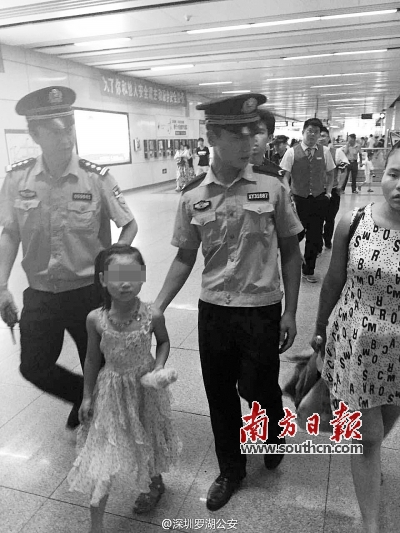9日16时20分,罗湖警方通过两天的海量监控排查以及目击者走访,锁定女子和女童美娇即将进入地铁2号线黄贝岭站,罗湖公交派出所民警紧急启动协防,在其进地铁A口安检闸口时将其控制。