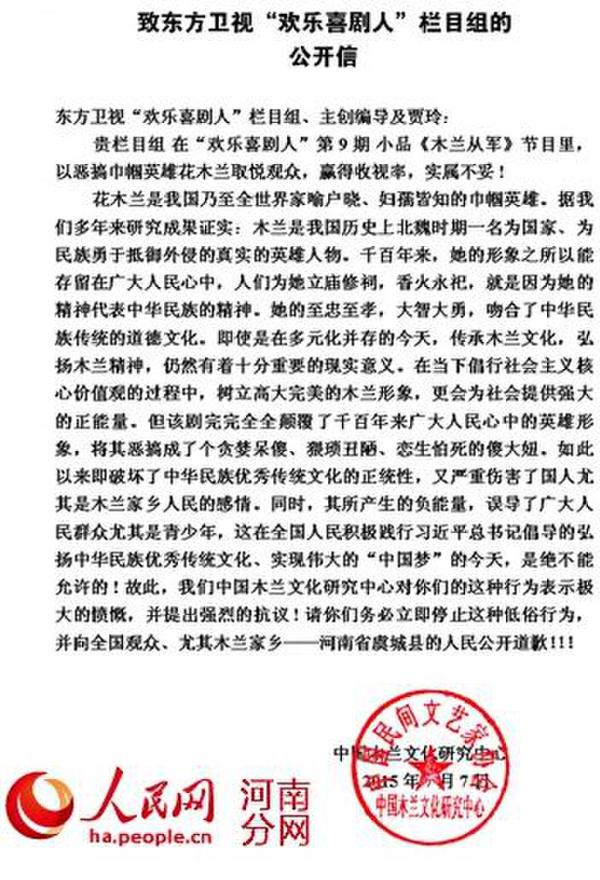中国木兰文化研究中心刊发公开信,要求贾玲及剧组公开道歉