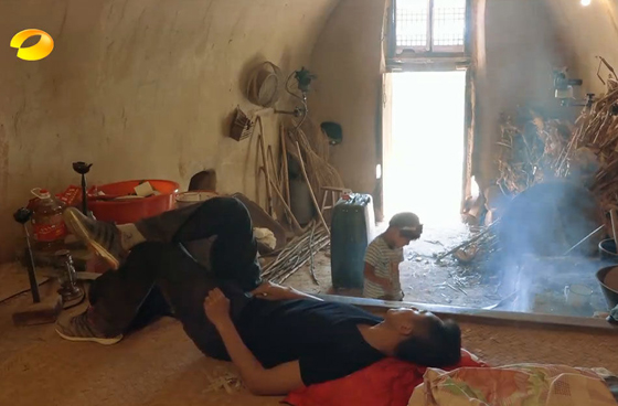 刘烨躺炕上,诺一在捣鼓柴火