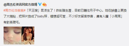 原标题:恭喜周杰伦当爸爸!爱妻昆凌剖腹产下女儿