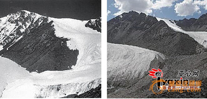 这张拼版照片显示的是1983年拍摄的天山一号冰川一角(左图)和2012年拍摄的天山一号冰川分离为东支与西支两条独立的冰川(右图)。据中科院天山冰川观测试验站观测数据显示,随着气温逐年升高,新疆天山一号冰川持续加速消融和退缩。
