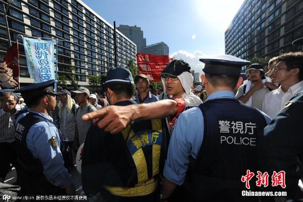 地时间2015年7月15日,日本东京,民众在国会前集会示威,抗议安倍政府推出的新安保法案。部分示威者与警方发生冲突。