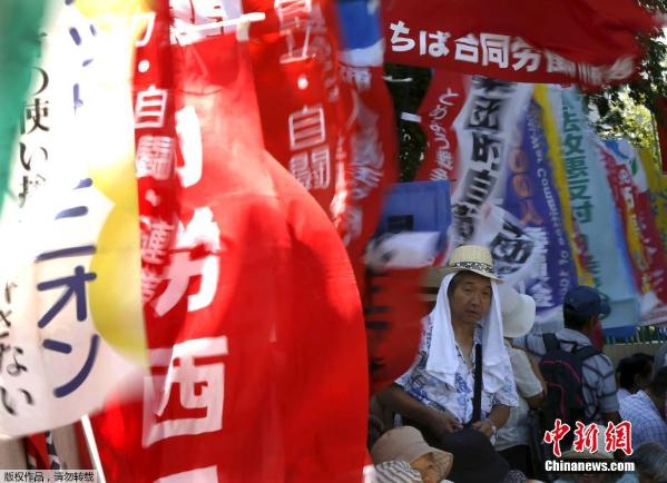 地时间2015年7月15日,日本东京,民众在国会前集会示威,抗议安倍政府推出的新安保法案。部分示威者与警方发生冲突。