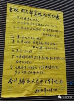 他亦被称为萍乡首富,其府邸“王府”极其豪华。央视报道曾揭穿“气功大师”王林,称其曾因诈骗入狱,治好癌症系杜撰。王林此前还被曝放上亿高利贷,借数千万给当地政府。图为现场贴出的欠款单。
