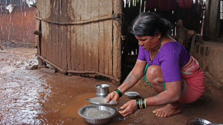 一位女主人Tuki在和记者闲聊时,另外两位女主人Saakhri和Bhaggi在一旁走来走去。她们的等级十分明晰,Tuki是Sakharam的第一位妻子,她笑着说:“我们结婚太久了,我都忘了是什么时候。”Saakhri和Bhaggi后来进入这个家庭嫁给Sakharam当第二、第三位妻子。图为Tuki在用雨水洗餐具。她负责照顾家,另外2为妻子负责出门打水。