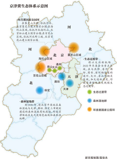根据《京津冀协同发展纲要》,北京将以大兴新机场、2022年冬奥会等重要区域为重点,在与燕郊、香河、廊坊、固安、涿州相接壤的通州、大兴、房山等相关区域,进一步加大造林力度,形成京津冀大规模生态过渡带。