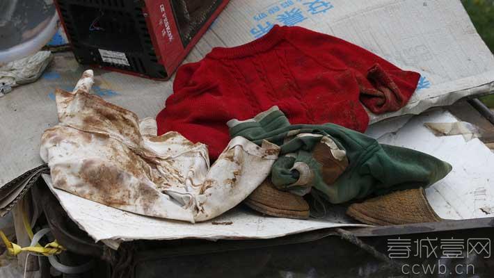 记者看到了路路当时穿的衣、裤、鞋子在一个推车上放着,是泥是血分不清。