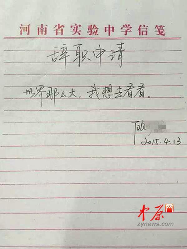 4月13日,顾少强写的辞职信。今年春节期间,顾少强与于夫在大理相识。当时,她在一家咖啡店做义工。假期结束离开大理前,两人互留微信,一个月里感情迅速升温。不到两个月,两人便确定关系,并开始为未来筹划。于夫迅速转让了发廊的店面,顾少强决心辞职。并拉开了“世界那么大,我想去看看”的序幕。