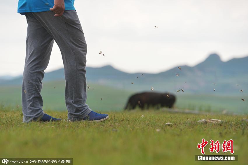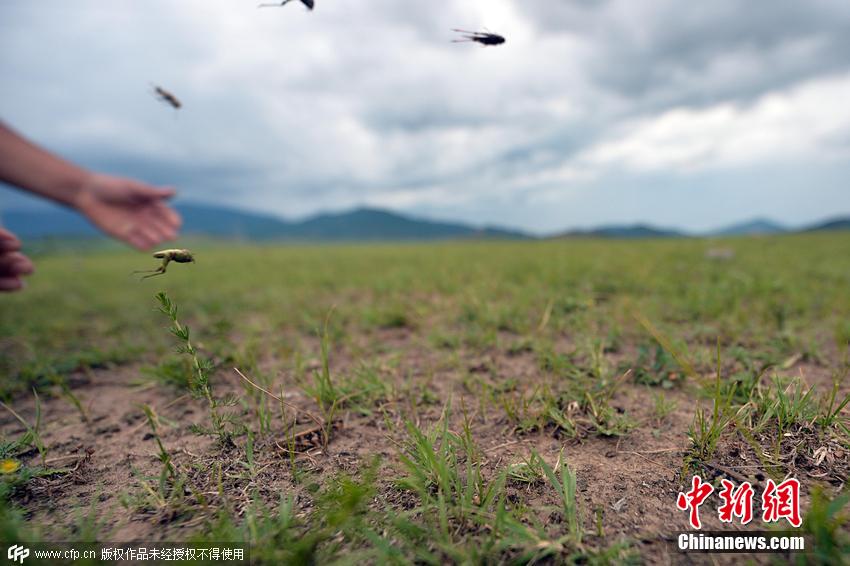 入夏以来,巴林左旗部分天然草原爆发蝗灾,严重侵蚀草原的同时也影响了当地农牧民的生产生活。 图片来源:CFP视觉中国