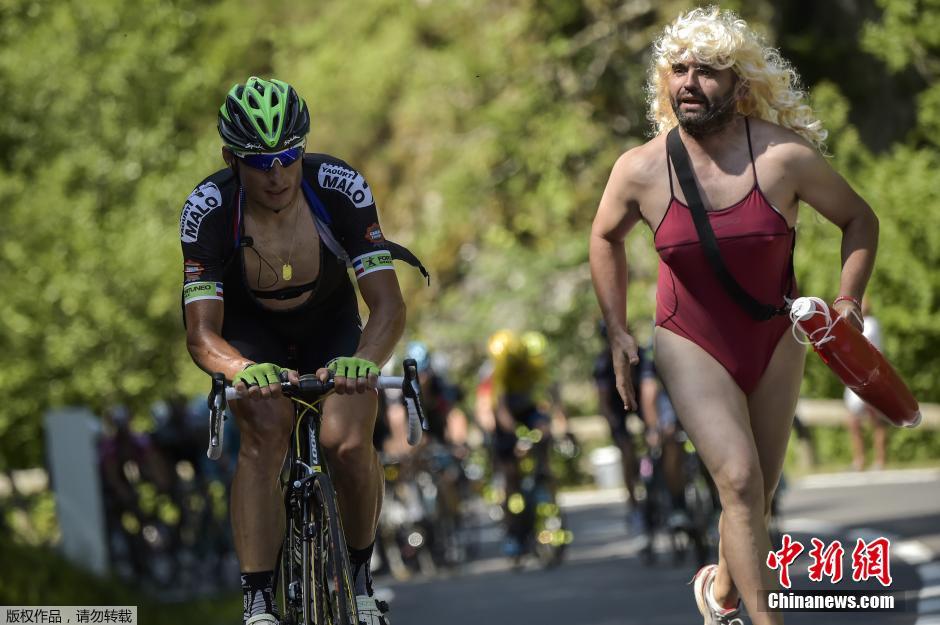 7月14日,第102届环法第十赛段进行,一名打扮另类的粉丝在给车手加油。