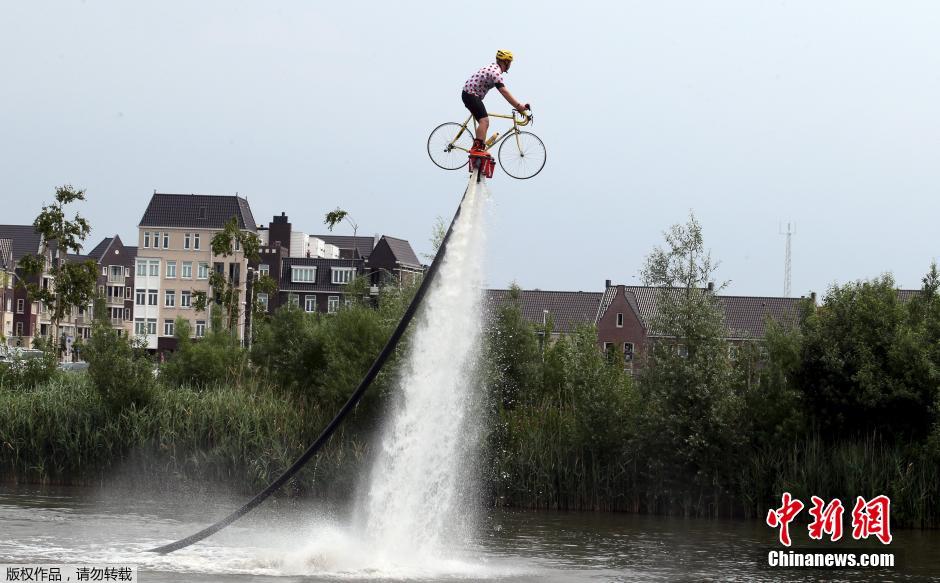 7月5日,环法第二赛段开赛前,一名自行车迷身穿斑点衫玩起了“高空杂技”。