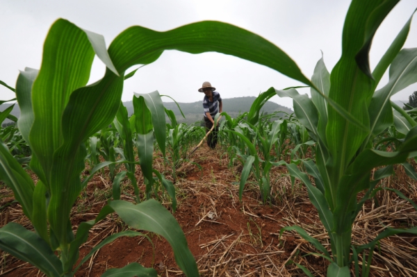 7月23日,山东省枣庄市山亭区大峪村农民在玉米地中劳作。