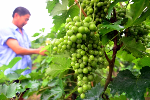 7月23日,山东省茌平县洪屯镇小马村农民在给葡萄打叉。