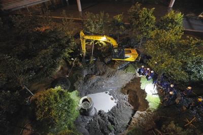 今日零时许,现场抢险人员找到了自来水管道的漏水点。