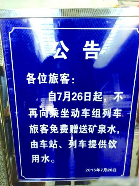 不过,26日,不少人在天津站发现了这样一张公告:“自7月26日起,不再向乘坐动车组列车旅客免费赠送矿泉水,由车站、列车提供饮用水。”记者采访后获悉,“这是按照中国铁路总公司下发的通知,动车停止供应矿泉水”。