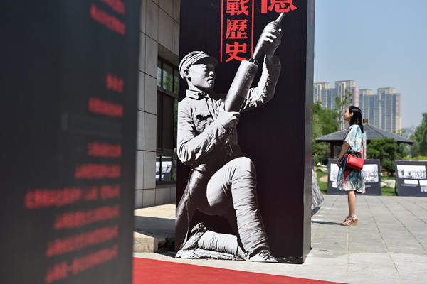 7月25日,一名参观者在参观展出图片。当日,为纪念抗日战争胜利70周年,“国家记忆暨三晋抗战历史影像展”在山西省太原市汾河景区免费开展。展览共选取200余幅图片,展示了抗日战争时期中国军民全面抗战的英勇事迹。新华社发