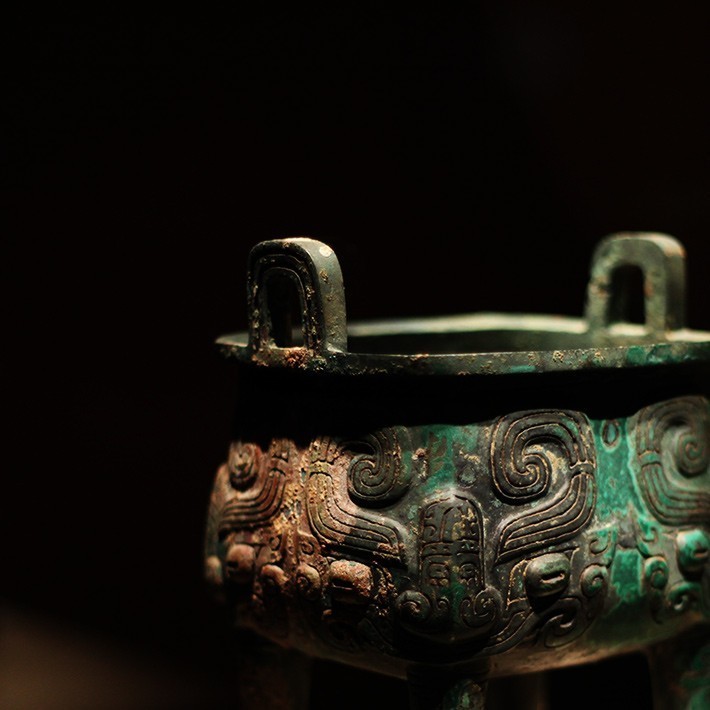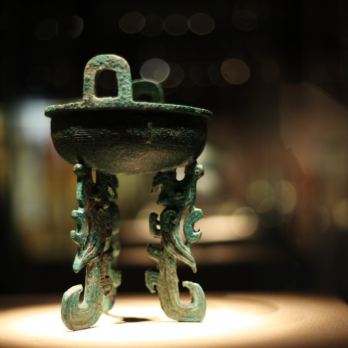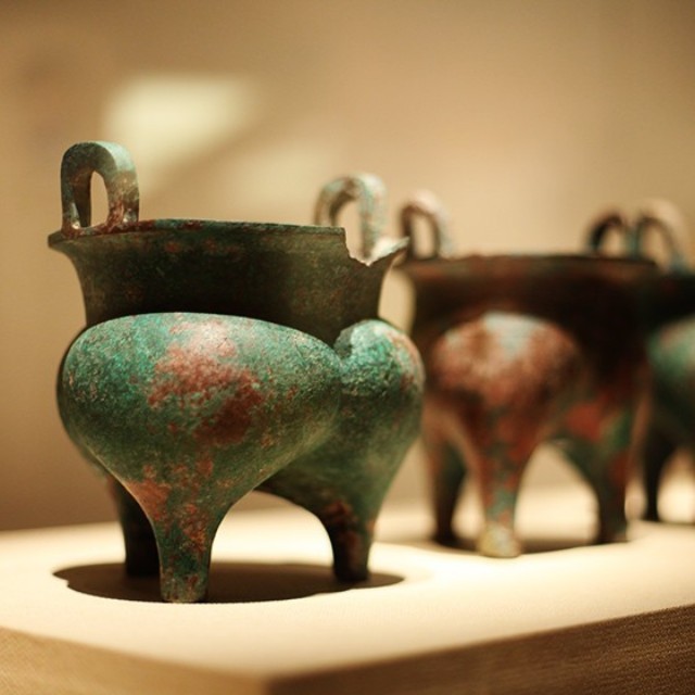 序厅往里,左边是大量精美的青铜器和比青铜器更能象征身份地位的原始瓷器等。青铜器中最引人注目的是一件“带盖四足方鼎”,其形酷似现在的安卓系统的logo小机器人——莫非这件鼎是“安卓君”的祖先?