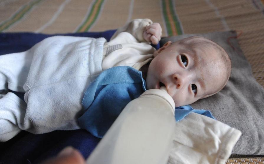 现在每天只给孩子吃两次奶,每次两杯勺,孩子因为饥饿一直啼哭,也不能让他多吃。