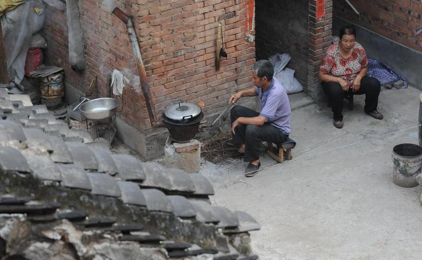 恩泽奶奶介绍着家里的现状,老伴患有血管瘤、腰间盘突出、多种疾病缠身,自己高血压、脑梗塞。孩子爸爸在两年前打工时不慎骨折,一瘸一拐地在长治一家工厂打工,每月所得的2000多元是家里唯一的经济来源。图为疾病缠身的爷爷带着奶奶正在生火准备晚饭。