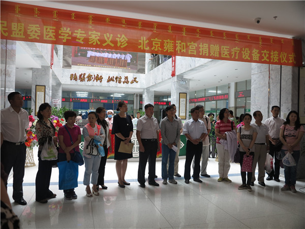7月23日,由民盟市委秘书长赵雅君带队,雍和宫管理处副主任高欣、翻译刘淑东及 10位医疗专家等组成医疗队,赴内蒙锡林郭勒盟西乌珠穆沁旗人民医院开展义诊活动。医疗队配备了较强的医疗专家队伍,由北京大学第三医院儿科主任医师王新利,北京中医医院脾胃科主任医师陶林,北京安贞医院心外科主任医师穆军升、心内科副任医师梁静,北京中医药大学国医堂内科主任医师李洪娟,北京大学人民医院神经内科主任医师刘献增,中国医学科学院肿瘤医院胸外科副主任医生邵康,北京中医药大学东直门医院呼吸科副主任医师任传云,北京普仁医院普外科副主任医师魏文杰和北京电力医院妇科副主任医师张琰组成专家医疗队前往义诊现场。